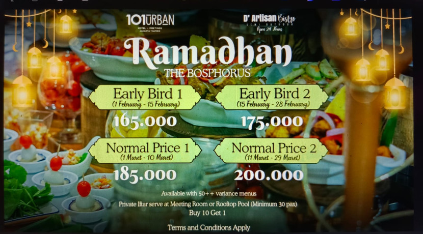 "Ramadan adalah waktu yang tepat untuk berbagi kebahagiaan dan menciptakan kenangan indah bersama keluarga dan orang-orang terkasih. Melalui tema 'Ramadan The Bosphorus', kami ingin membawa para tamu dalam perjalanan kuliner yang unik dan tak terlupakan, dengan cita rasa otentik Turki yang kaya dan menggugah selera," ujar Randika Alfanur, Food and Beverages Manager Hotel 1O1 URBAN Jakarta Thamrin.